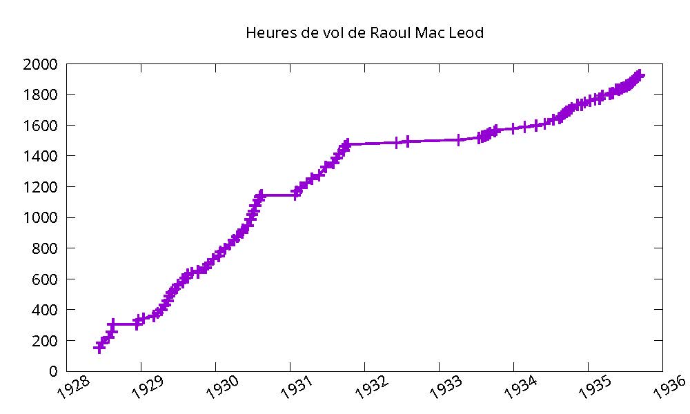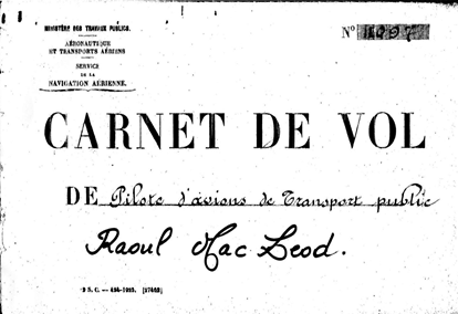 Raoul Mac Leod est breveté pilote militaire en septembre 1926 puis pilote d’avions de transport public en mai 1928. Son carnet de vol débute le 11 juin 1928 par un vol de 3h40 Paris-Londres sur un Farman Goliath, alors qu’il avait 153 heures à son actif. Suivent alors une série de vols Londres-Paris et Paris-Londres sur Goliath et Lioré et Olivier. Il est donc employé sur cette ligne. Il vole également sur Breguet et Berline SPAD. On trouve aussi quelques vols Paris-Lyon, Paris-Marseille et Lyon-Marseille.